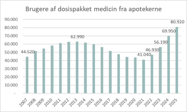Historisk mange danskere får nu dosispakket deres medicin på apoteket. Helt nye tal fra Sundhedsdatastyrelsen viser, at 80.920 borgere i 2025 modtog medicin i dosispakker fra deres apotek. Det er næsten en fordobling på fire år - altså siden 2021, hvor antallet var det laveste siden 2007.